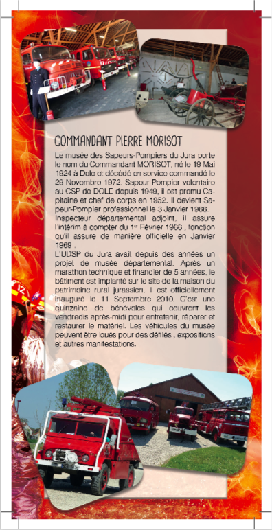 L’autre grande réalisation de la commission Histoire et Musée est la construction, du Musée des sapeurs-pompiers du Jura sur le site de la Maison du Patrimoine à Saint Aubin. Inauguré le 11 septembre 2010, le musée port le nom de Pierre MORISOT, du corps départemental des sapeurs-pompiers du Jura et président de l’UDSPJ mort en service commandé le 29 novembre 1972.